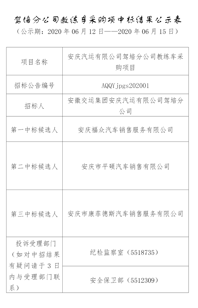 駕培分公司教練車采購項中標結(jié)果公示表
