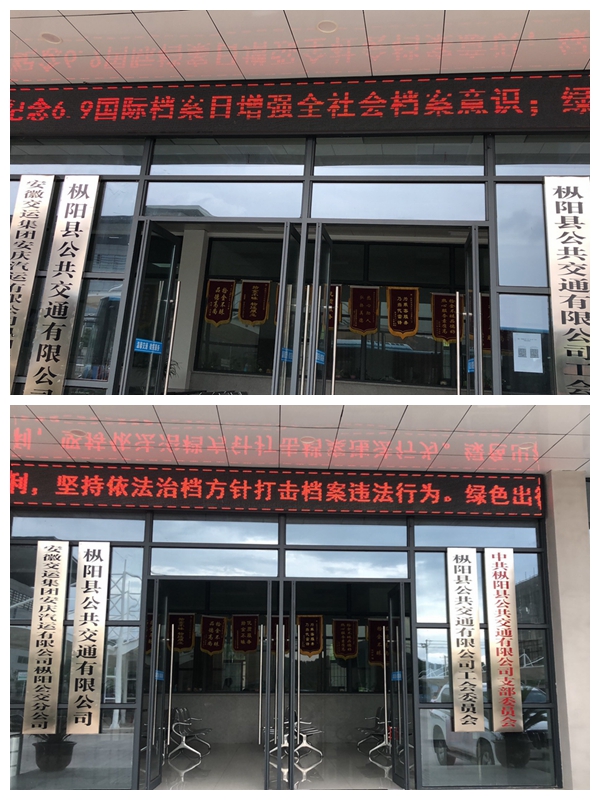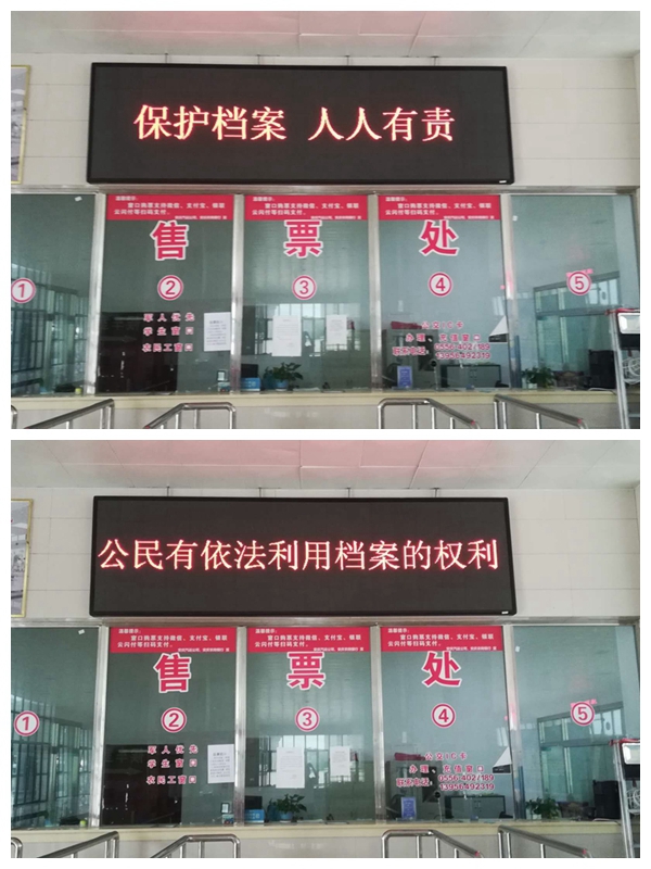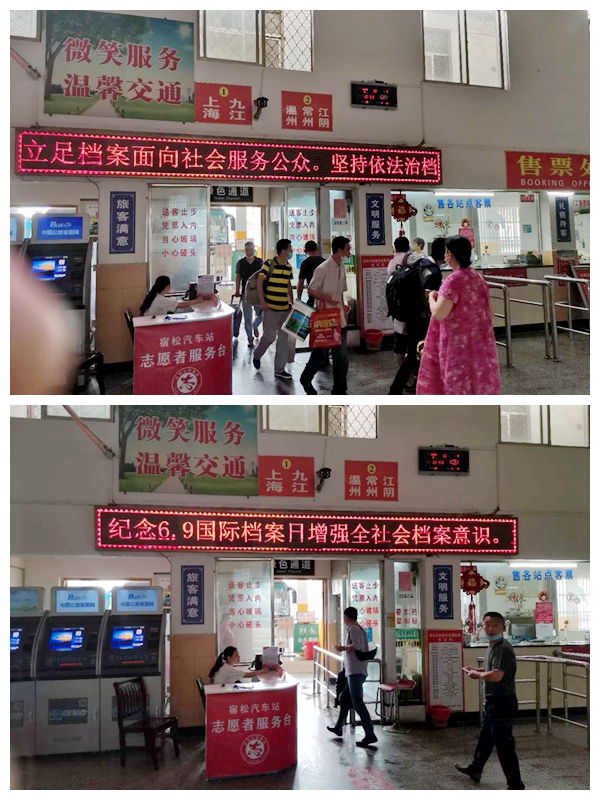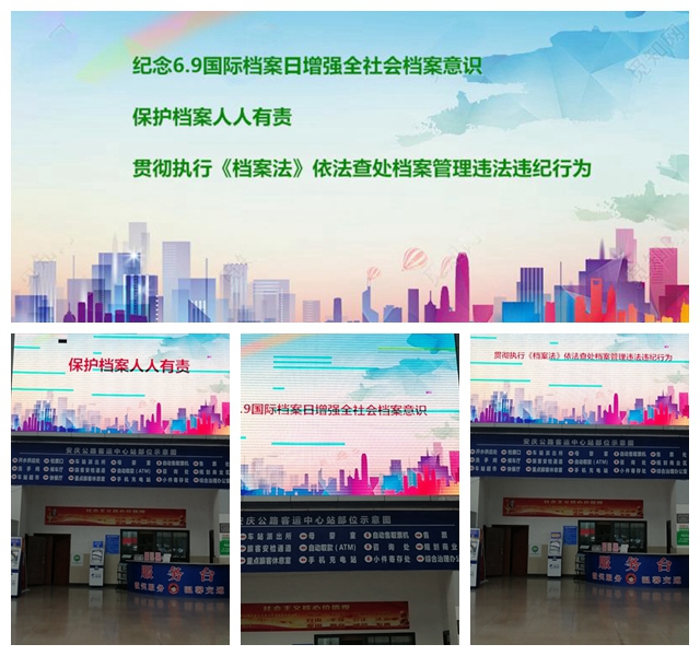 6月9日,宿松分公司在候車大廳電子顯示屏幕上不間斷播放檔案法宣傳標(biāo)語。為做好新時代檔案工作營造良好的輿論氛圍,充分發(fā)揮其“記錄歷史,傳承文明,服務(wù)社會,造福人民”的獨特作用。