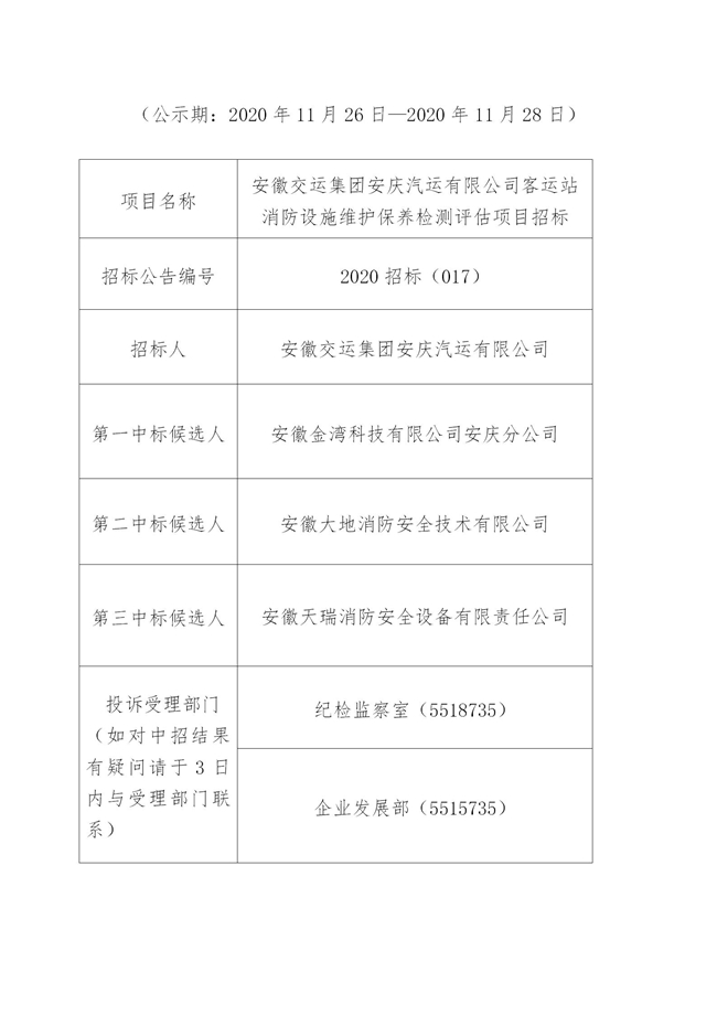 公司客運(yùn)站消防設(shè)施維護(hù)保養(yǎng)檢測(cè)評(píng)估項(xiàng)目招標(biāo)中標(biāo)結(jié)果公示表