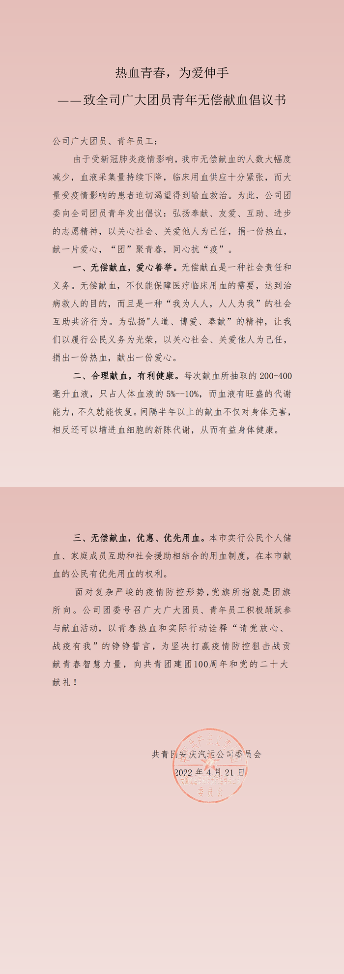 致全司廣大團員青年無償獻血倡議書