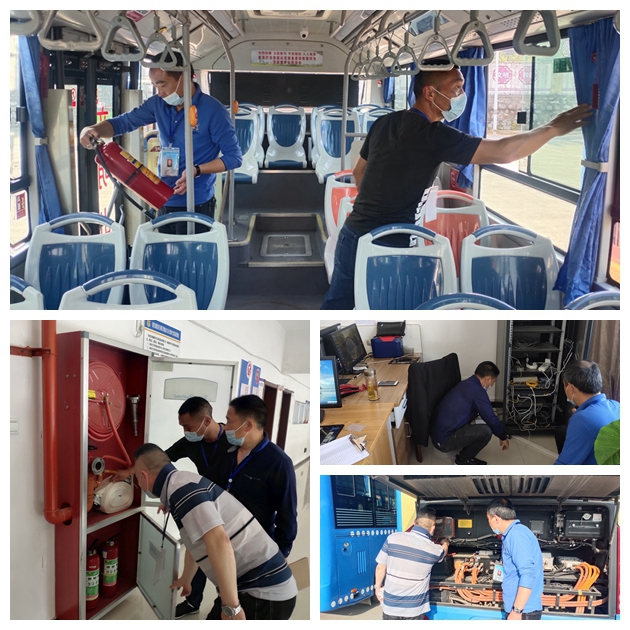 檢查組實(shí)地對(duì)辦公區(qū)域的電路設(shè)施、消防設(shè)施進(jìn)行了查看,重點(diǎn)檢查了停保場(chǎng)的滅火器、消防池,車(chē)間的電路設(shè)施以及充電樁、配電房等,確保消防設(shè)施安全有效,充電樁、配電房能正常工作。隨后檢查組對(duì)運(yùn)營(yíng)車(chē)輛的滅火器、安全錘、三角木、緊急逃生出口等進(jìn)行了認(rèn)真排查。