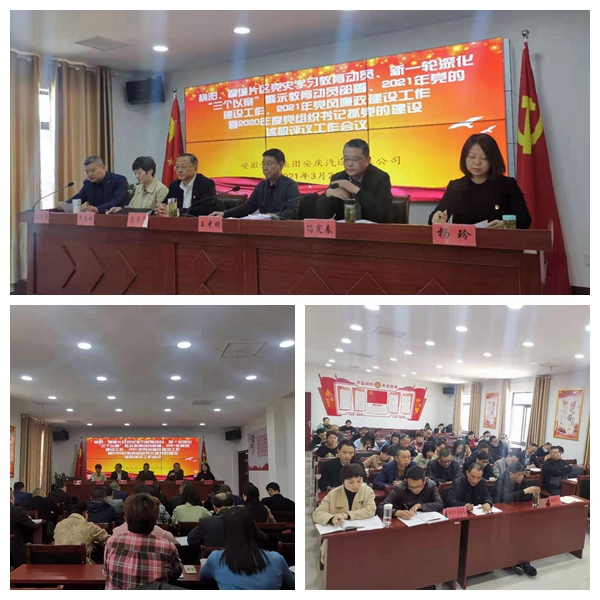 2021年3月23日下午,公司在望江分公司合并召開望江和懷寧兩片區(qū)四個單位領(lǐng)導(dǎo)班子成員及黨員代表參加的黨史學(xué)習(xí)教育動員、新一輪深化“三個以案”警示教育部署、2021年黨的建設(shè)工作、2021年黨風(fēng)廉政建設(shè)工作暨2020年度黨組織書記抓黨的建設(shè)述職評議工作會議。公司領(lǐng)導(dǎo)王中明、馮定春、余雙友出席了會議。